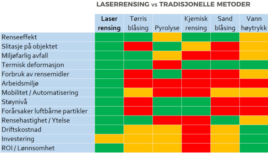 Moderne metoder, som laserrensemaskiner, er et godt alternativ til å erstatte tradisjonelle prosesser, som kjemisk rensing, mekanisk sliping og pelletsblåsing, som nå er blitt for arbeidskrevende, for kostbart og heller ikke miljøriktig.